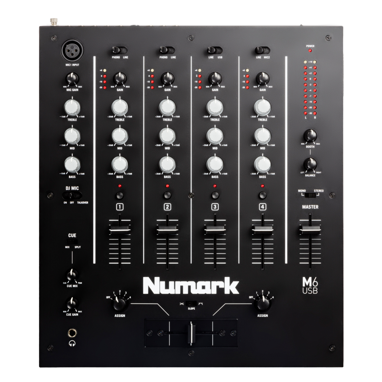 Numark M6 USB Black este un mixer de DJ cu 4 canale, EQ pe 3 benzi, Gain, conexiune USB pentru redare, intrari multiple phono, line si 2 intrari de microfon precum si crossfader cu slope control.