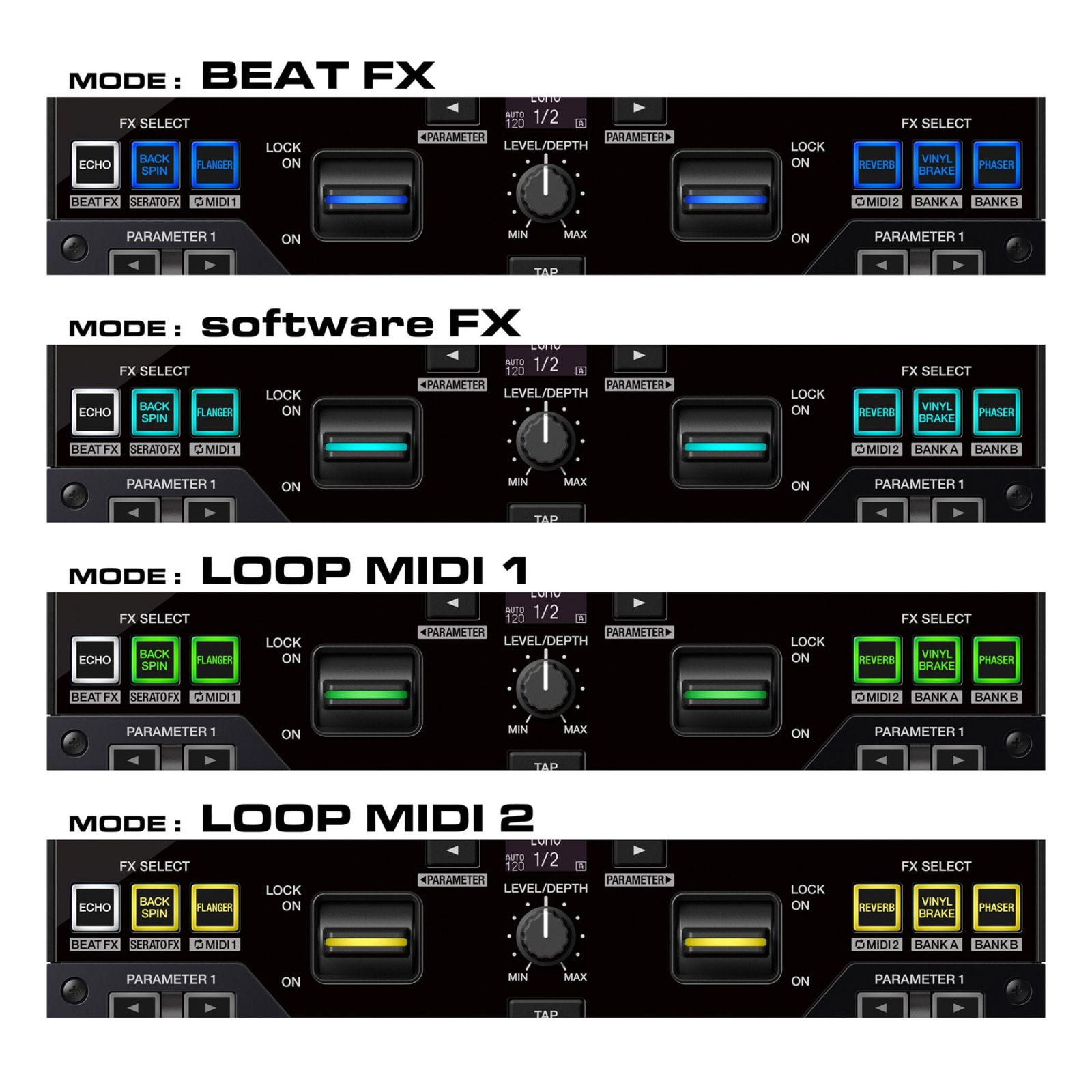Functii: MIC Talkover, Dual USB, Loop Section, HotCue, Loop Roll, Sampler, Crossfader reverse, Crossfader curve adjust, CH Fader curve adjust, Instant Doubles, Saved Loops, Transport (Play/Stop/Sync/Nudge), CH fader Reverse, Crossfader tension control, Bluetooth