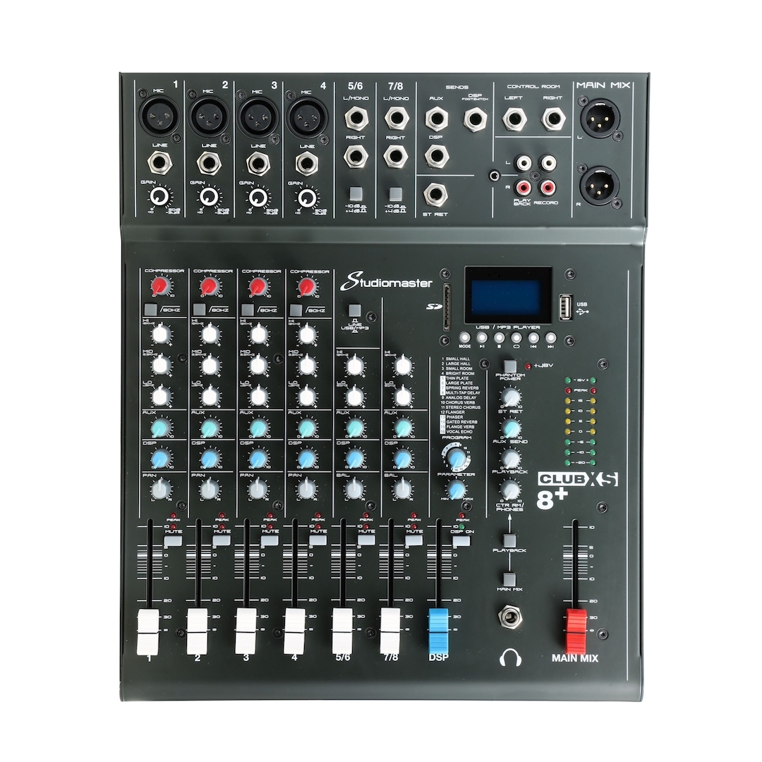 StudioMaster CLUB XS8+ - Mixer analog cu design compact, carcasă rezistentă, efecte DSP și tehnologie Bluetooth, ideal pentru concerte acustice și evenimente de dimensiuni mici.